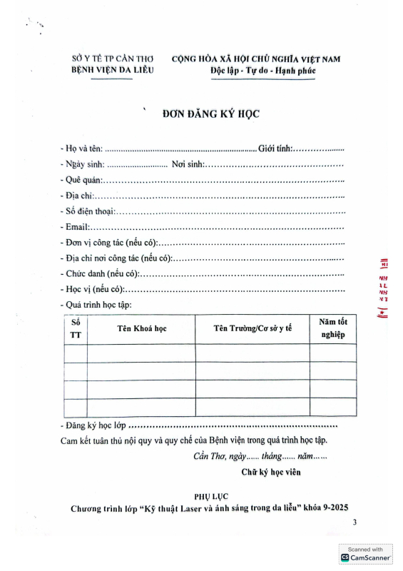 Bệnh viện Da Liễu TP Cần Thơ thông báo gia hạn chiêu sinh khoá học: KỸ THUẬT LASER VÀ ÁNH SÁNG TRONG DA LIỄU KHÓA 9