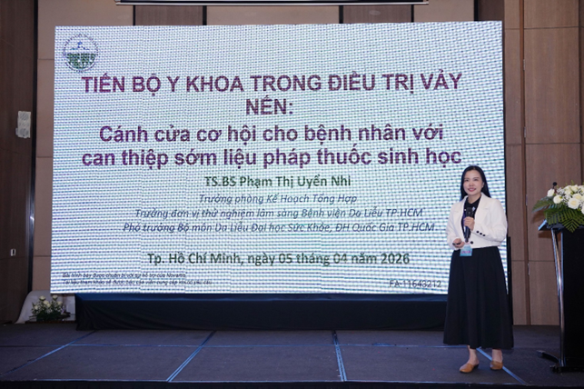Mở đầu là phần trình bày của TS.BS. Phạm Thị Uyển Nhi – Trưởng phòng phụ trách phòng Kế hoạch tổng hợp, Trưởng Đơn vị Thử nghiệm lâm sàng Bệnh viện Da liễu thành phố Hồ Chí Minh, Phó trưởng Bộ môn Da liễu, Khoa Y Trường Đại học Khoa học Sức khoẻ “Tiến bộ y khoa trong điều trị vảy nến: cánh cửa cơ hội cho bệnh nhân với can thiệp sớm liệu pháp thuốc sinh học”