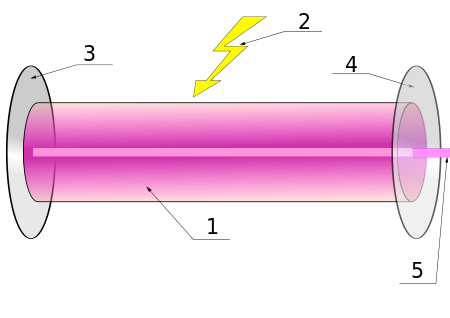 1-buồng cộng hưởng; 2-nguồn nuôi (bơm); 3-gương phản xạ toàn phần; 4- gương bán mạ; 5- tia laser