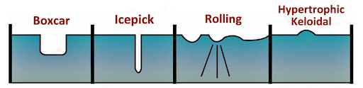 - Đối bằng và nông. Sẹo thường có góc cạnh thẳng đứng, đường kính từ 2 đến 4mm và sâu khoảng 1.5mm. Sẹo thường được tìm thấy hai bên má và thái dương.
